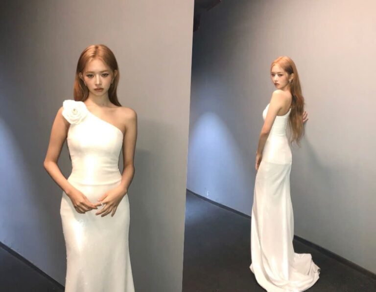 LE SSERAFIMのカズハがホワイトドレスを披露し、清純かつセクシーな魅力で注目を集めた。